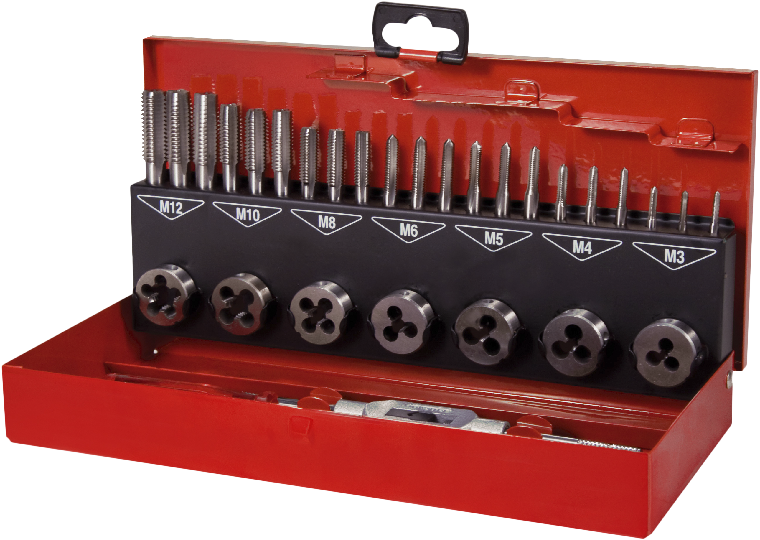 Indeholder håndtappe sæt med spids, mellem og bundtappe M3, M4, M5, M6, M8, M10, M12.