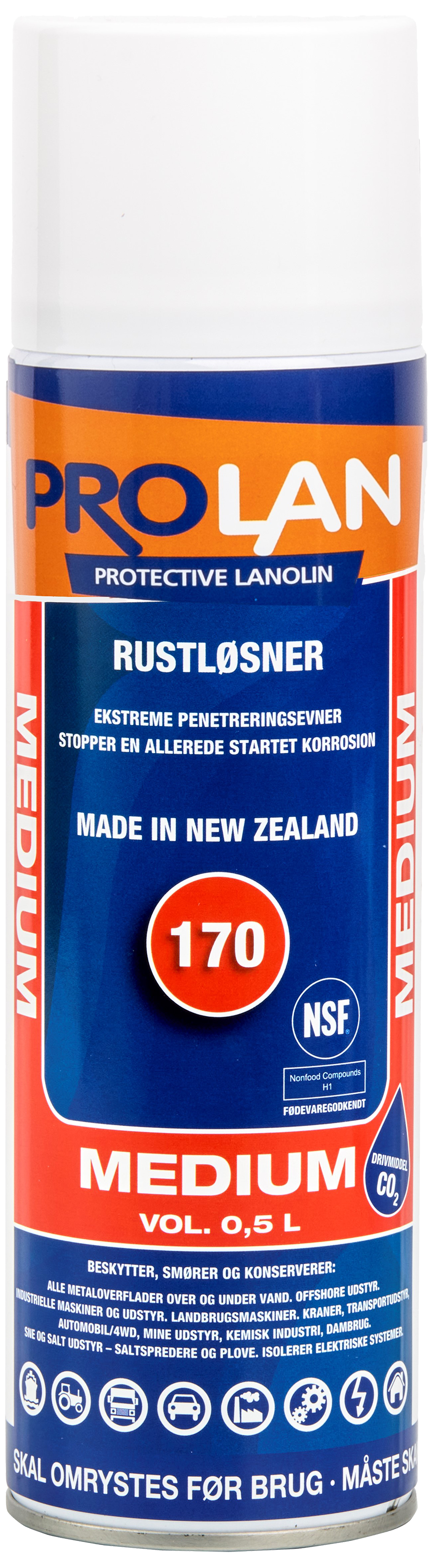 Prolan Medium er det perfekte middel til mindre smørings- og anti-korrosionsopgaver da det penetrerer ind i rust, samlinger og kroge. Benyttes som bl.a. rustbeskyttelse på ATV-chassis o.l. samt som universal-værkstedssmøremiddel og til beskyttelse af reservedele, elektriske samlinger, korrosionsbeskyttelse og smøring på både, motorer og trailere. Produktet er elektrisk adskillende op til 70 kV, biologisk nedbrydelig og modstår syrer og salte. Udvaskes og fordamper ikke. Lukker overflader hermetisk for ilt. Tåler afvaskning med højtryksrenser. Sikker at anvende på syntetiske materialer, gummi og elektriske systemer. Internationalt Fødevaregodkendt til klasse H1,H2 og R2. Indeholder lanolin, blandet med ikke regulerede paraffiner for at lette påføring. Produktet kan fjernes igen med Porlan Cleaner eller lugtfri olie. Fås i flere varianter.