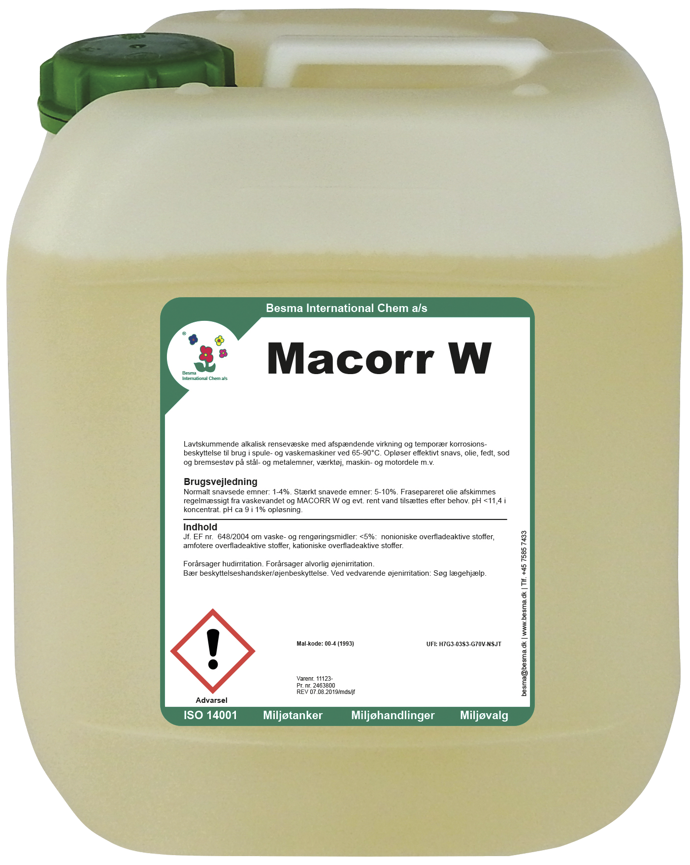 Macorr W er en lavtskummende alkalisk rensevæske med forstærket korrosionsbeskyttende egenskaber til brug i spule- og vaskemaskiner (65°-90°C). Rensevæsken opløser effektivt snavs, olie, fedt, sod og bremsestøv på stål- og metalemner, værktøj, maskin- og motordele mv. Specielt velegnet til emner af støbegods. Rensevæsken har en afspændende effekt og god separationsevne. Biologisk nedbrydeligt. pH-værdi koncentreret < 11,4 og pH-værdi i 1 % opløsning ca. 9. Fås i flere varianter.