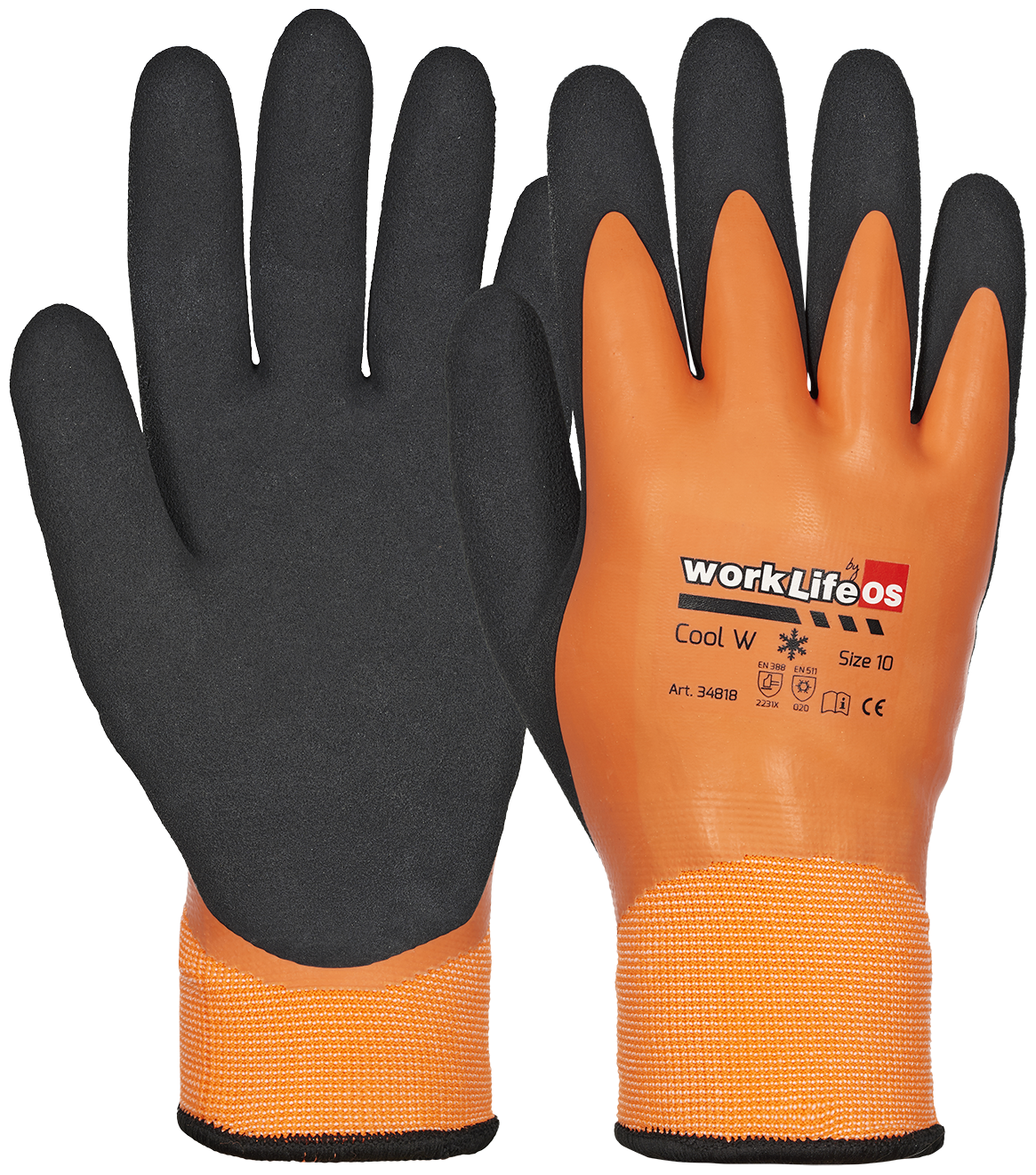 Dobbeltforet, sømløs WorkLife vinterhandske med ribkrave. Heldyppet polyesterhandske med foamoverflade og latex belægning. Dobbeltforet med polyester og akrylfrotté. Ideel til lager- og vedligeholdelsesarbejde udendørs og i kølehuse, hvor der er brug for at beskytte hænderne mod kulde. Godkendelse: EN 388:2016, EN 511:2006 og EN 420:2003+A1:2009. Kategori II.