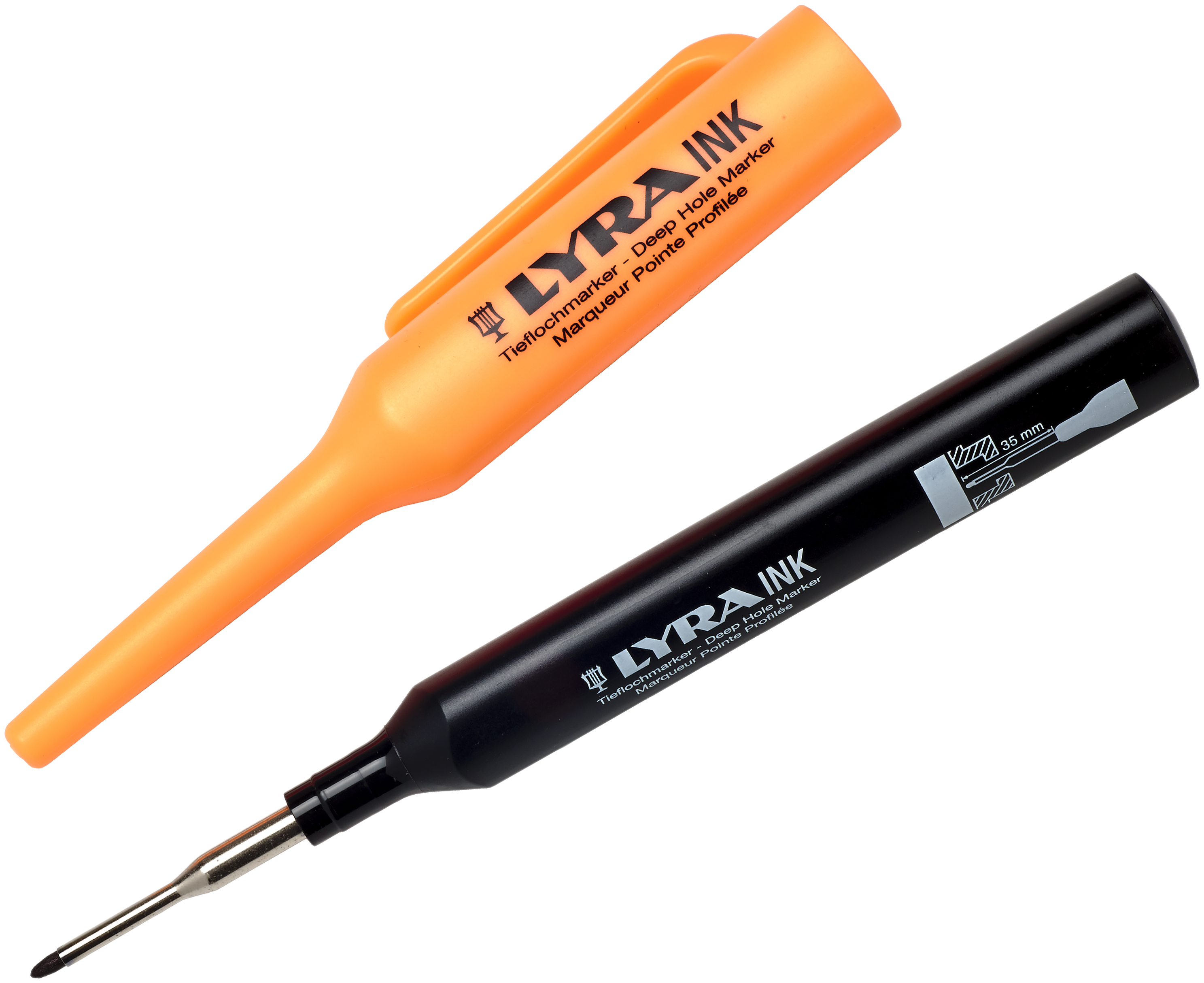 Lyra dybhulsmarkør. Velegnet til utilgængelige steder, forlænget pennespids i rustfri stål. Permanent, vandfast. Fås i flere farver.