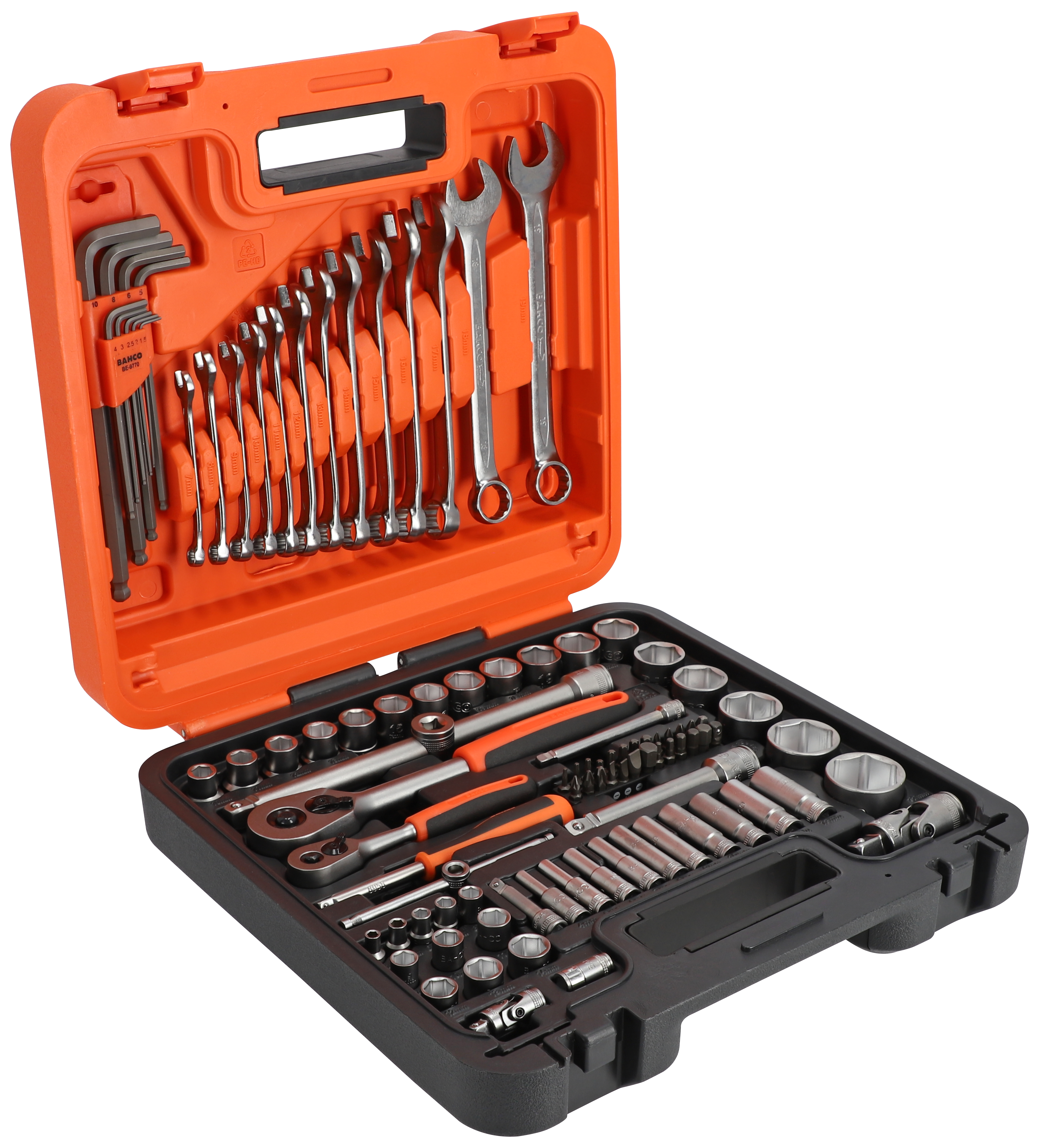 Stort topnøglesæt 1/4" & 1/2" med 98 dele. Indeholder skraldenøgler, forlængere, kardanled, vridhåndtag, glidegreb, bits, bitsholder samt korte og lange toppe (4,5-14 mm). Herudover stiftnøglesæt med 9 dele (1,5-10 mm) og ring-gaffelnøgler (7-19 mm).
