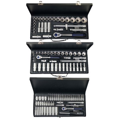 Kombipakke bestående af 3 forskellige topnøglesæt. Topnøglesæt 1112 med 28 dele: 1/2" toppe kort 10-11-12-13-14-15-16-17-18-19-21-22-24-27-30-32-34-36 mm, toppe lang 10-13-17-19 mm, tændrørstoppe 16-21 mm, forlænger med Wobble 125 og 250 mm, kardanled og skraldenøgle med udløser - Leveret i metalkuffert. Topnøglesæt 1212 med 38 dele: 3/8" toppe kort 6-7-8-9-10-11-12-13-14-15-16-17-18-19-20-21-22-24 mm, toppe lang 6-7-8-9-10-11-12-13-14-15-16-17-18-19 mm, forlænger med Wobble 43-100-200 mm, T-greb adapter 1/2-3/8", kardanled og skraldenøgle 48T med udløser - Leveret i metalkuffert. Topnøglesæt 1312 med 46 dele: 1/4" toppe kort 4-4,5-5-5,5-6-7-8-9-10-11-12-13-14 mm, toppe lang 6-7-8-9-10-11-12-13-14 mm, stifttoppe 6kt 3-4-5-6-7-8 mm, Torx 10-15-20-25-30-40, PZ 1-2, PH 1-2-5, kærv 5,5 mm, forlænger med Wobble 50-100 mm, T-glider, kardanled, tophåndtag med firkant i toppen og skraldenøgle 48T med udløser - Leveret i metalkuffert.