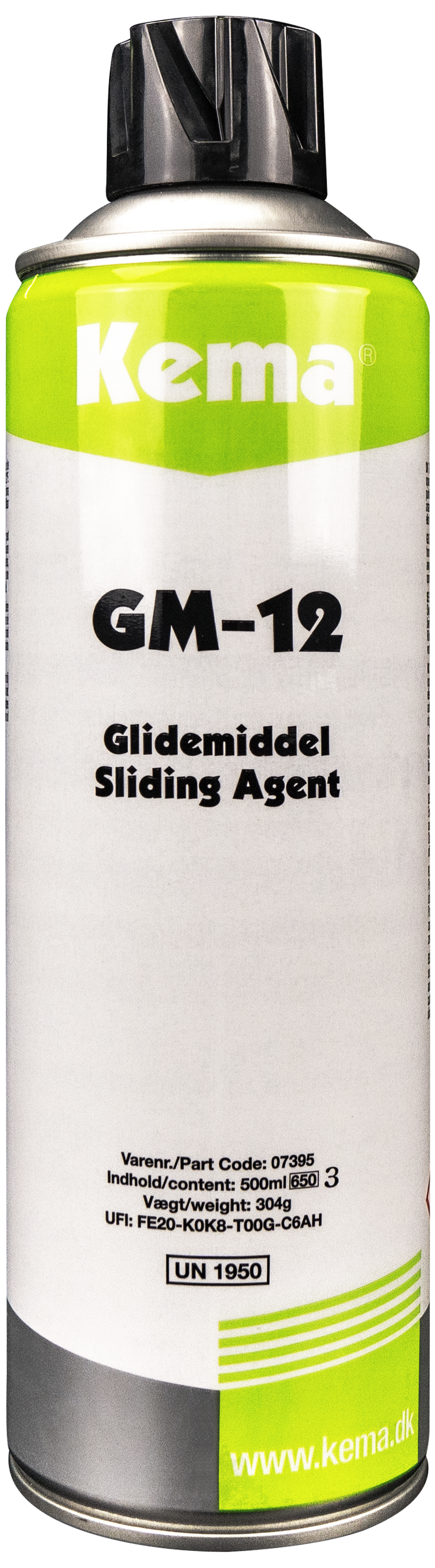 Glidemiddel er fremstillet specielt til montage af elkabler og gummilister mv. Montagen glider lettere og rivning af emnerne undgås. Glidemidlet fjerner friktion under samling af kloak-, fald- og trykrør af ABS- og PVC-plast og skåner samtidig pakninger mv. GM-12 er også velegnet som vinyl make-up til biler.
