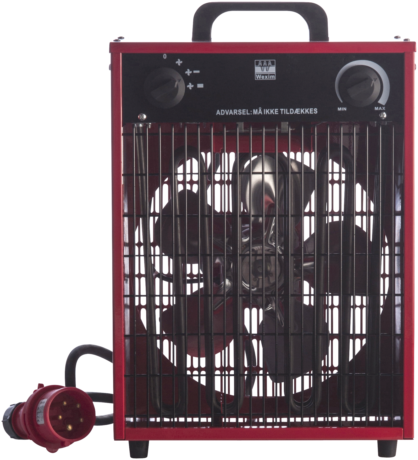 Varmeblæser til 400 V. Monteret med 1,6 mtr. 5G1,5 mm² neopren gummikabel H07RN-F med CEE stikprop. IP44.