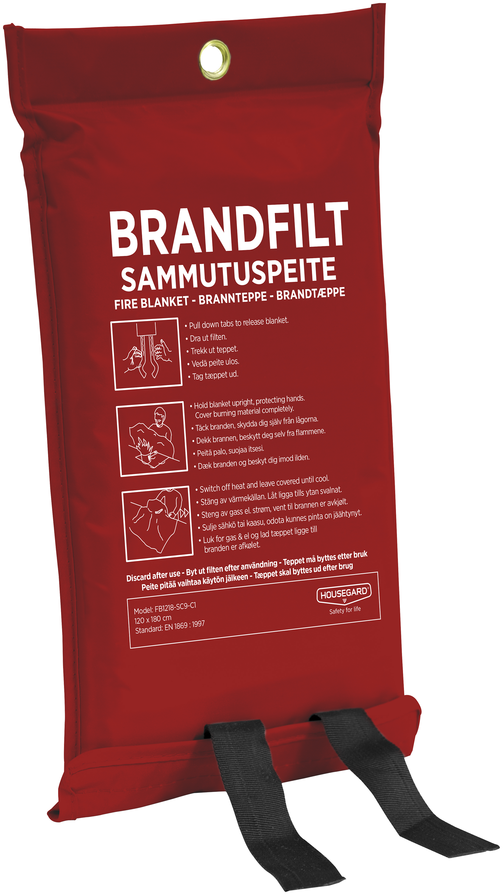 Standardbrandtæppe til placering og anvendelse i hjem, kontorer, køkkener og andre offentlige steder.