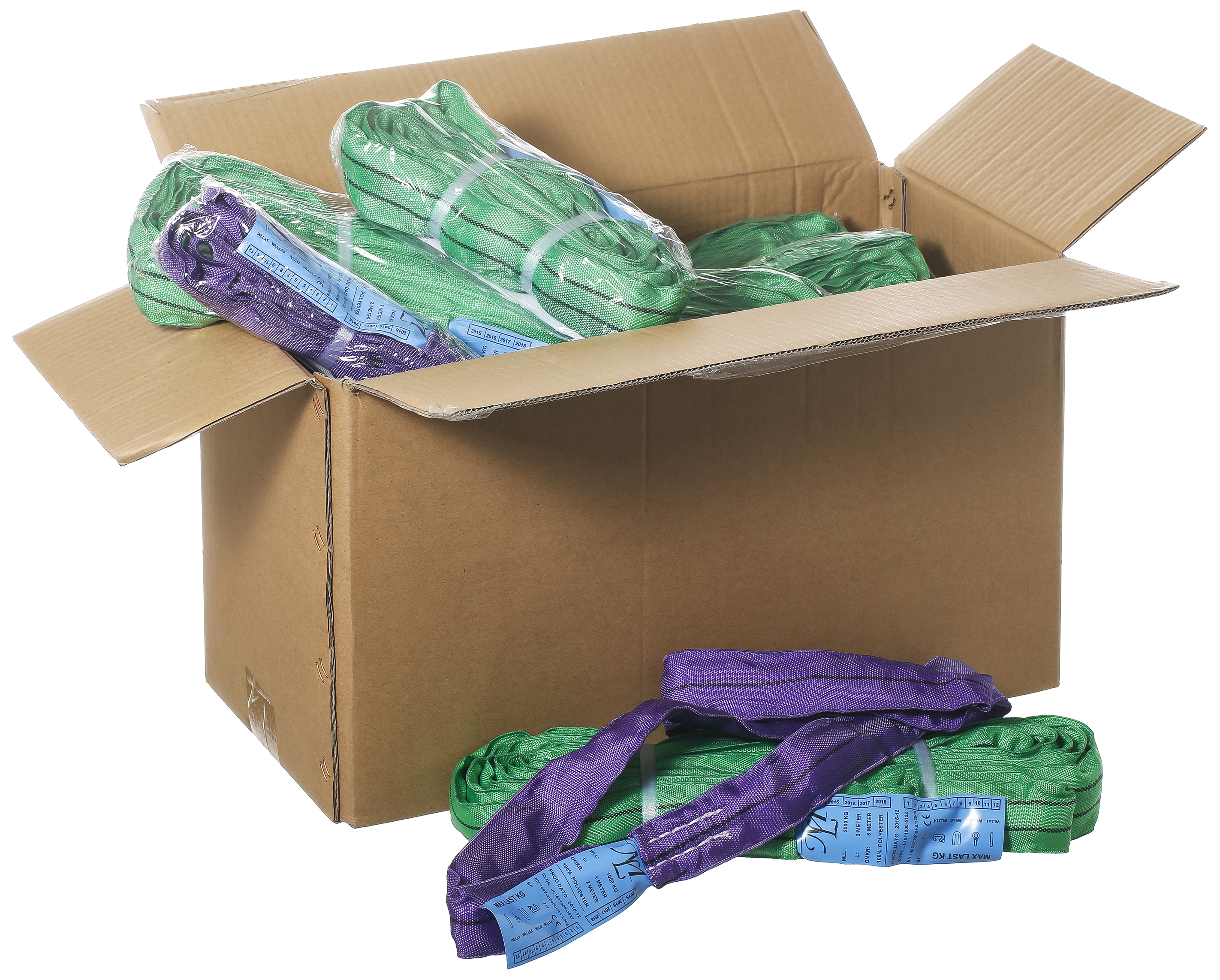 8 stk. SWL 1.000 kg heraf 4 stk. 1 mtr. lange og 4 stk. 2 mtr. Lange samt 12 stk. SWL 2.000 kg heraf 4 stk. 1,5 mtr. Lange, 4 stk. 3 mtr. lange og 4 stk. 4 mtr. lange.