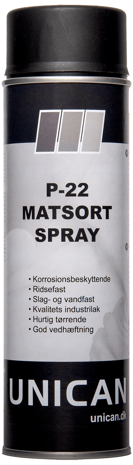 P-22 Matsort spray er en vandfast og yderst slidstærk industrilak, som efter påførelse efterlader en flot matsort korrosionsbeskyttende finish. P-22 tørrer hurtigt op og lakerede emner kan derfor hurtigt tages i brug uden afsmitningsfare. Inden brug bør man sikre sig, at overfladen der ønskes malet, er ren og tør. Fjern evt. fedt, voks og andet snavs med C-1000 Power Cleaner. Påfør P-22 Matsort spray udendørs eller i lokaler med tilstrækkelige udluftningsmuligheder. Produktet bør for bedste resultat påføres i en temperatur på mellem 15°C-25°C og en luftfugtighed på ikke under 60%. Ryst dåsen omhyggeligt. Afvent 4-5 minutter imellem hver påføring dog max. 25 min. Efter endt brug vendes dåsen på hovedet og der sprayes i nogle få sekunder, derved rengøres dysen og man undgår dermed tilstopning.