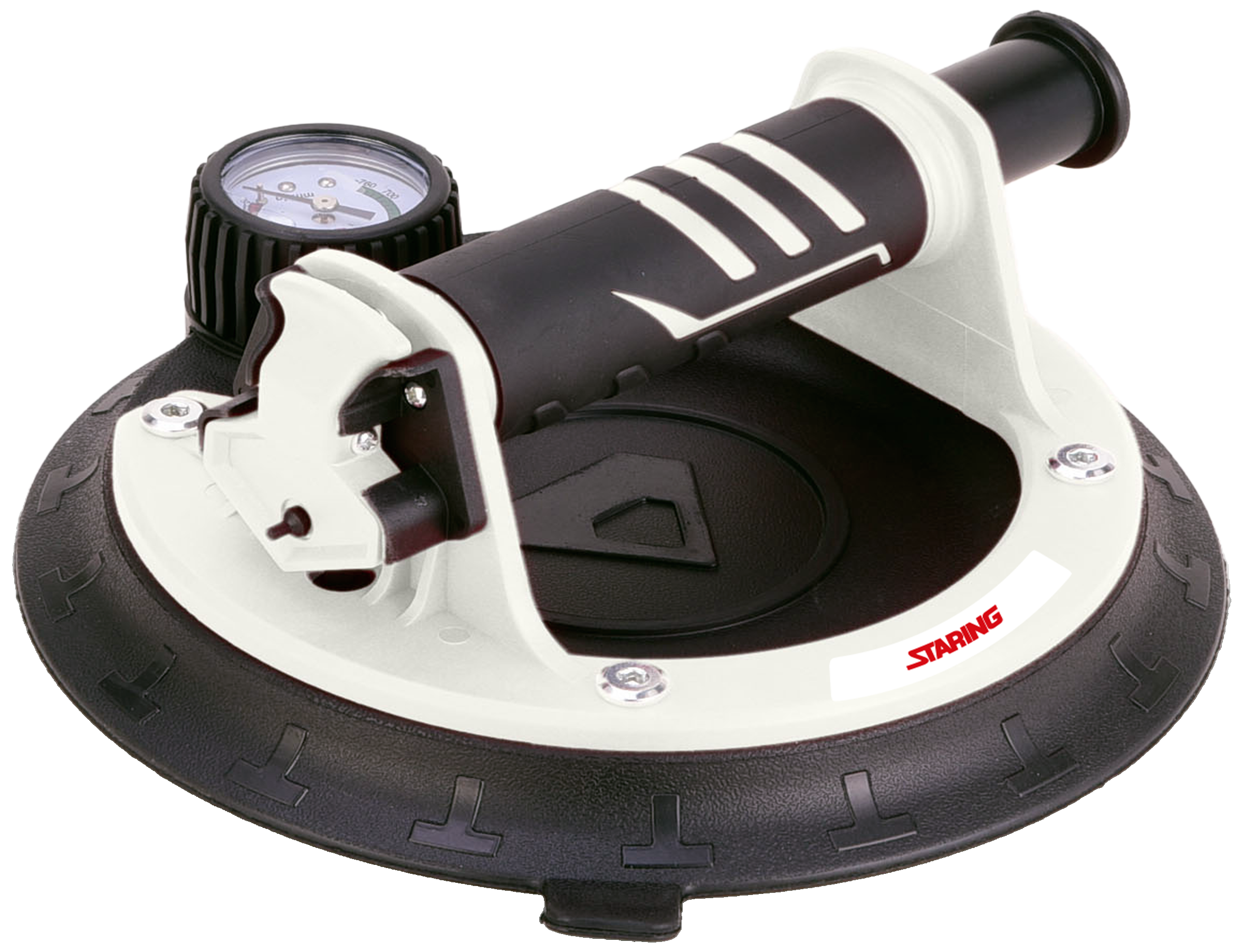 Stærk sugekop med manometer, der viser vakuum-tryk under betjening. Manometeret medvirker til ekstra præcision og sikkerhed under løft. Sugekoppen er speciel velegnet til pålidelig håndtering af fliser, klinker eller lignende materialer. STL-205-10 har nem betjening, pålideligt greb og kan anvendes på både glatte og ru overflader. Sugekoppen kan løfte vertikalt op til 128 kg og horisontalt op til 158 kg.