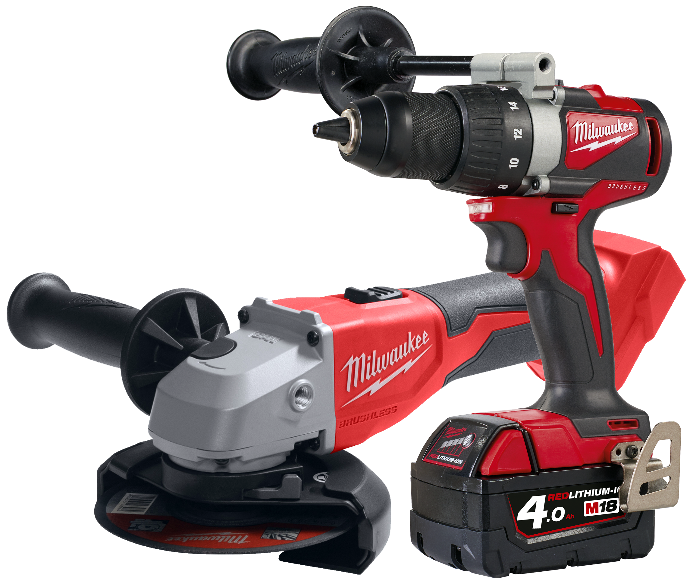 Sampak af to maskiner: Kulfri bore-/skruemaskine med optimal balance med længde på kun 180 mm, ideel til arbejde over hovedhøjde og på trange steder. Avanceret heavy-duty fæste - 13 mm metalborepatron for hurtigt skift af bit. Strømindikator og LED-lys. Vendbar bælteklips i metal. Redlithium batteri og Redlink elektronik leverer kraft, driftstid og holdbarhed. Fleksibelt batterisystem: passer med alle Milwaukee M18 batterier. Redlink overbelastningsbeskyttelse i både batteri og værktøj giver klassens bedste holdbarhed.0-1.800 omdr./min. i 2 gear. Maks. moment 82 Nm. Kapacitet stål/træ 13/76 mm. Leveres inkl. bælteklips og støttegreb samt 2×18V/4,0Ah M18 batterier, M12-M18 multilader og HD boks. Kulfri 125 mm vinkelsliber med ydeevne som en 800 W ledningsdrevet model. Integreret Fixtec system til værktøjsfrit skiveskift. 11.000 omdr./min - optimeret til alle skæreopgaver. Sikkerhedskobling - beskytter brugeren mod tilbageslag. 125 mm beskyttelsesskærm - stor skærekapacitet og hurtig justering uden at bruge en nøgle. Slankt design. Låsbar afbryder. Line-lock-out funktion forhindrer automatisk opstart. Leveres uden batterier og lader.