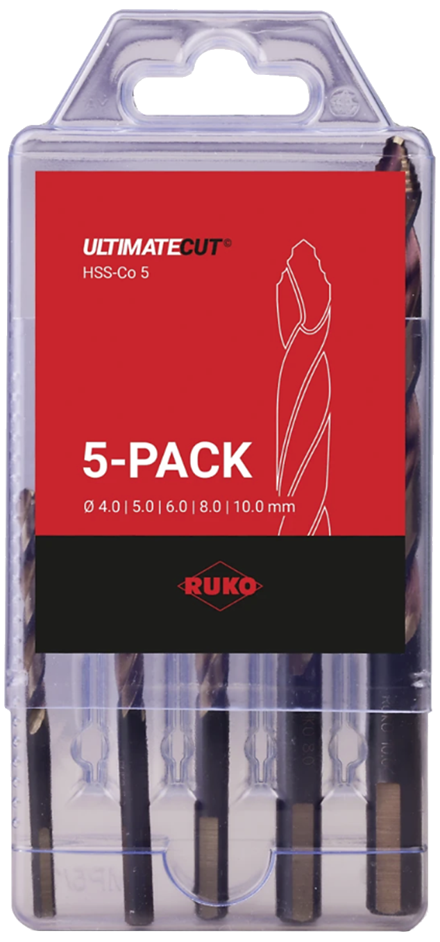 UltimateCut spiralborsæt til boring i bl.a. rustfri samt syre- og varmebestandigt stål. Flowstep-spids - borer op til 5× flere huller, dobbelt så hurtig som standardbor. Skaft med 3 spændeflader. Sæt med 5 størrelser: 4,0 / 5,0 / 6,0 / 8,0 / 10,0 mm.